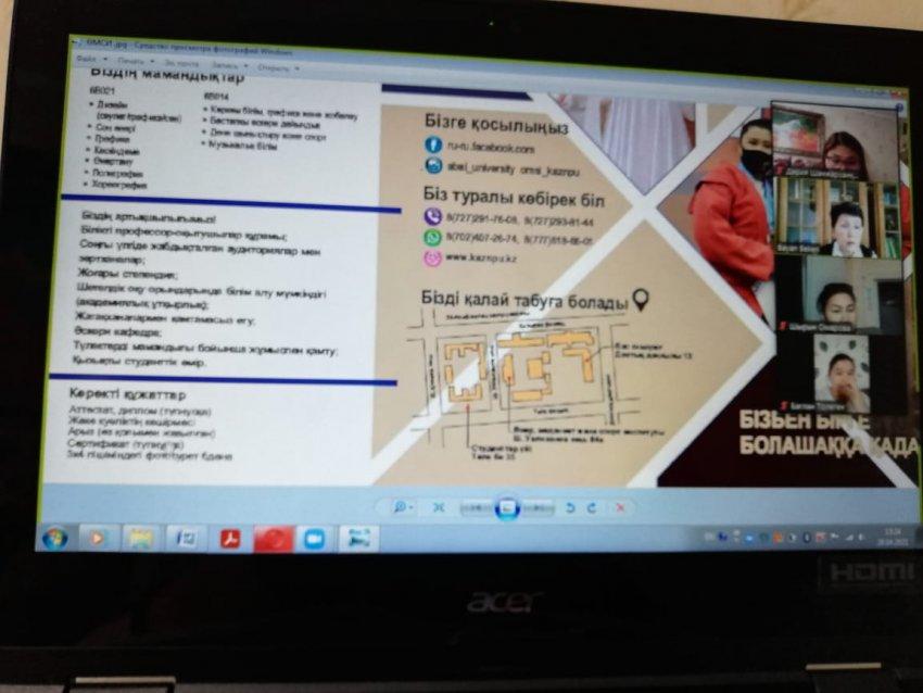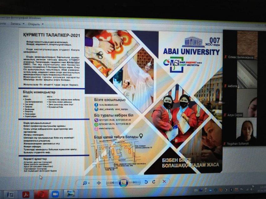 Абай атындағы Қазақ ұлттық педагогикалық университетінің Өнер, мәдениет және спорт институты Көркем білім кафедрасының аға оқытушысы,педагогика ғылымдарының магистрі Бекенова Баян Нығметқызы 11 "А" сынып оқушыларымен кәсіби бағдар жұмысын өткізді. Мектеп оқушыларына мамандықтарын дұрыс таңдауға бағыт беру маңызды іс. Таңдалған мамандық жеке тұлғаның болашақ өміріне әсер етеді. Кәсіби мақсатына дұрыс бағыт алған оқушы бойындағы қарым қабілетін шығармашылықпен дамыта білсе сапалы маман ретінде қалыптасады. Сол себепті қазіргі таңда түлектерге кәсіби бағдар ұсынып, кеңес айту үлкен маңызға іс. Осыған орай Бекенова Баян Нығметқызы факультеттегі мамандықтар жайында жан-жақты мәліметтер берді. Бітіруші түлектермен кездесуге мүмкіндік жасаған мектеп директоры Тұрмахан Рита Тәжімқызы. Кәсіби бағдар беру мақсатында өткен кездесуге директордың оқу-тәрбие ісі жөніндегі орынбасарлары Ш.З.Омарова, Д.Ш.Қалназарова онлайн қатысты. Түлектерге айтылған жайларға көңіл қойып тыңдау, өздеріңіздің болашақ мамандықтарыңызды дұрыс таңдауға септігін тигізеді. Қазіргі заман талабына сай мамандықтарды игерген жастарға сұраныс өте жоғары. Нарықтағы бәсекелестік күн өткен сайын артып келеді. Бүгінгі заман талабы кәсіптік білім беру саласында адамның табиғи ерекшеліктеріне сәйкес мыңдаған мамандықтар мен кәсіптерге дайындау – кезек күттірмейтін талаптардың бірі-деді.