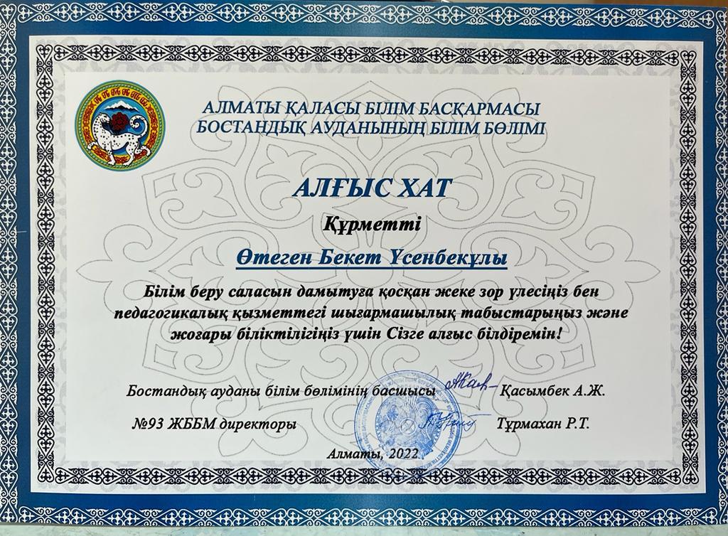 Білім беру саласын дамытуға қосқан жеке зор үлесі мен педагогикалық қызметтегі шығармашылық табыстары және жоғары біліктілігі үшін әріптесіміз, директордың тәрбие ісі жөніндегі орынбасары Өтеген Бекет Үсенбекұлы Бостандық ауданы білім бөлімінің АЛҒЫС ХАТЫМЕН марапатталды. Әріптесімізді марапатымен шын жүректен құттықтаймыз!