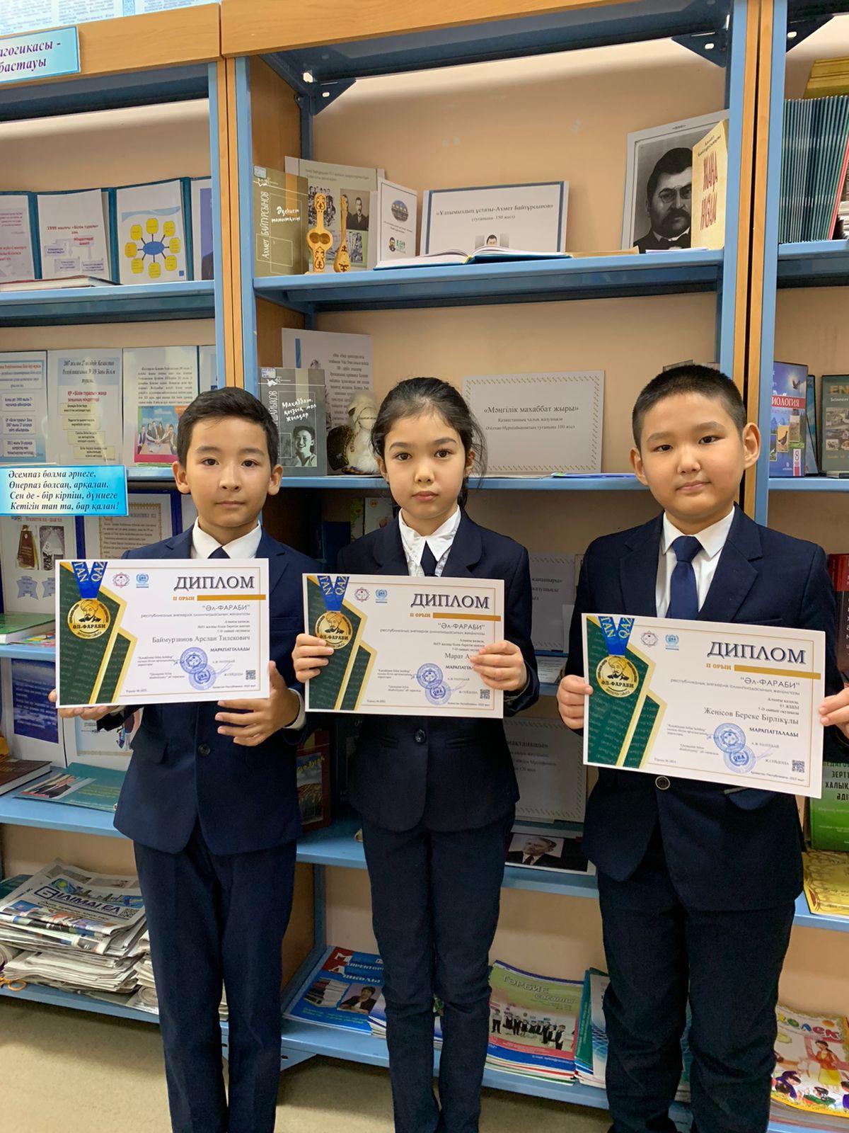 Қазақстан Білім академиясының ұйымдастыруымен өткізілген республикалық «Әл-Фараби» зияткерлік олимпиадасында үздік нәтиже көрсеткені үшін мектебіміздің 5-сынып оқушылары Жеңісов Береке, Баймурзинов Арслан, Марат Амира II дәрежелі дипломға ие болды. Жүлдегер атанған шәкірттерімізді шын жүректен құттықтаймыз!