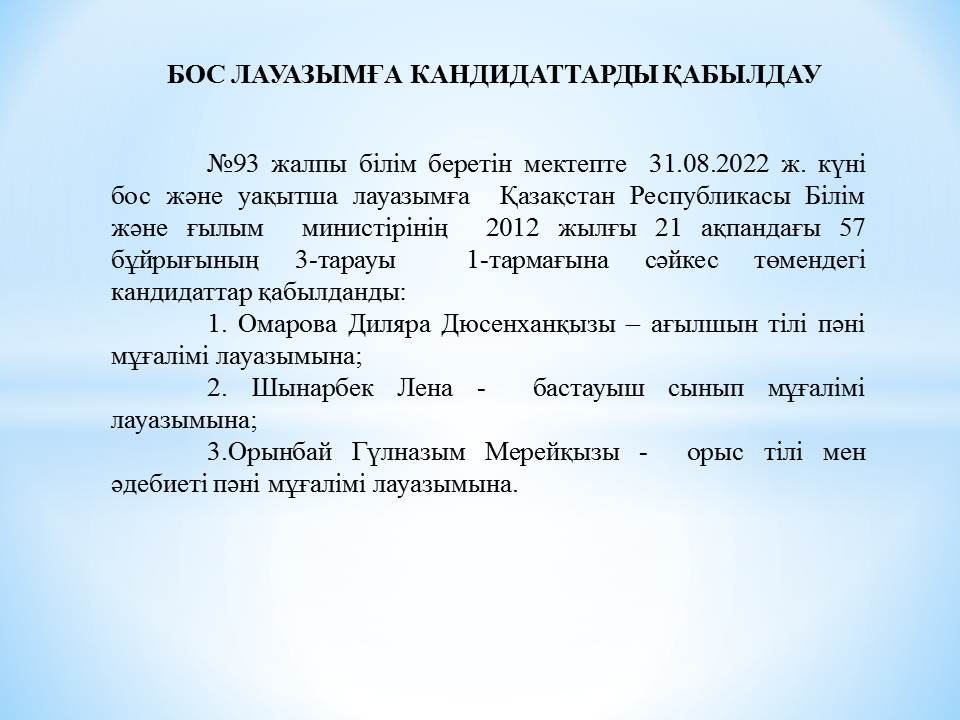 » БОС ЛАУАЗЫМҒА КАНДИДАТТАРДЫ ҚАБЫЛДАУ