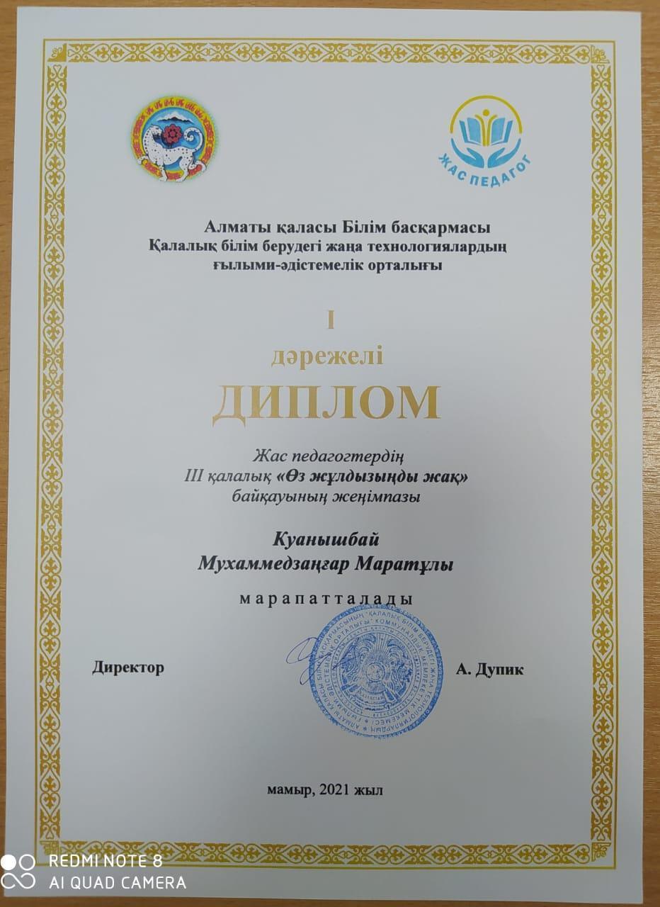 Алматы қаласы Білім басқармасының ұйымдастыруымен өткізілген жас педагогтердің III қалалық «Өз жұлдызыңды жақ» байқауында әріптесіміз, математика пәнінің мұғалімі Қуанышбай Мұхамедзаңғар Маратұлы жүлделі I (бірінші) дәрежелі дипломмен марапатталды. Шығармашыл әріптесімізді жеңісімен шын жүректен құттықтаймыз!