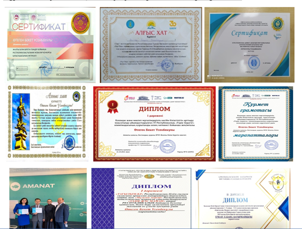 Колледж және мектеп мұғалімдерінің кәсіби біліктілігін арттыру мақсатында ұйымдастырылған IV Республикалық «Үздік педагог» олимпиадасының қорытынды кезең нәтижесі бойынша I (бірінші) дәрежелі диплом. Тіркеу №D-226952.