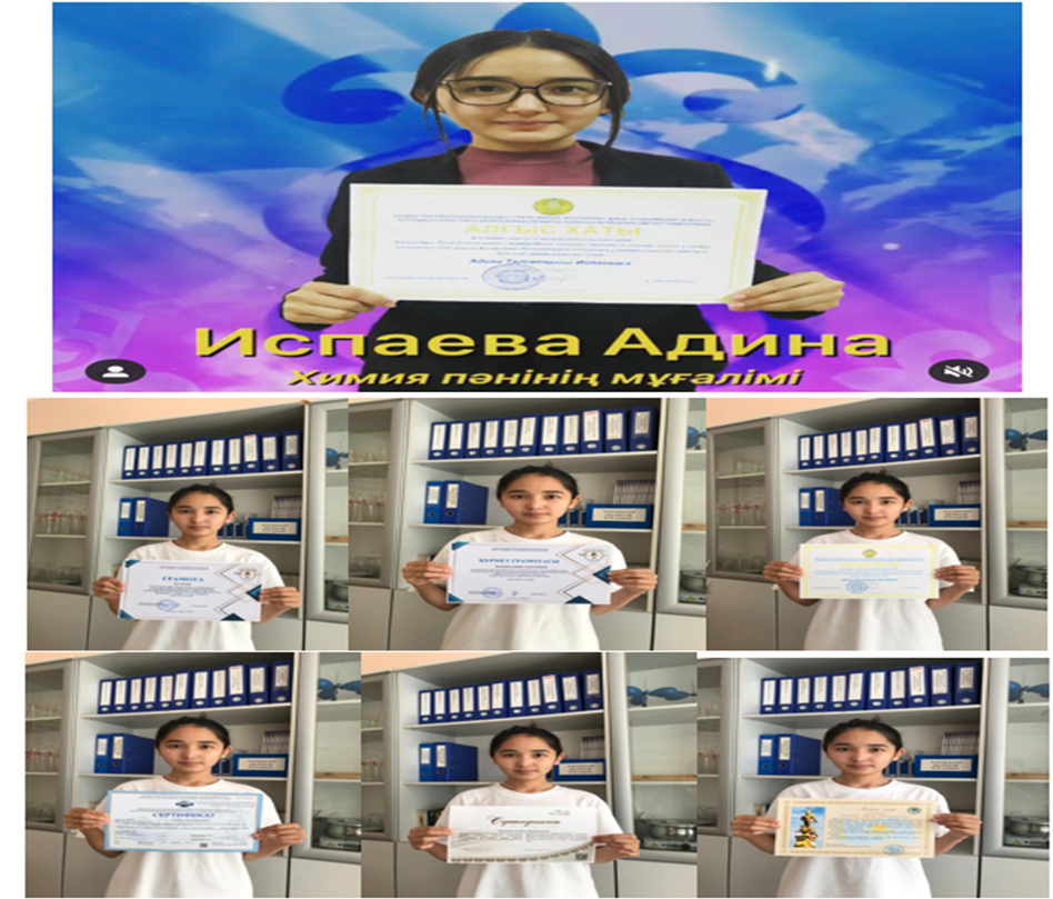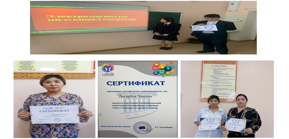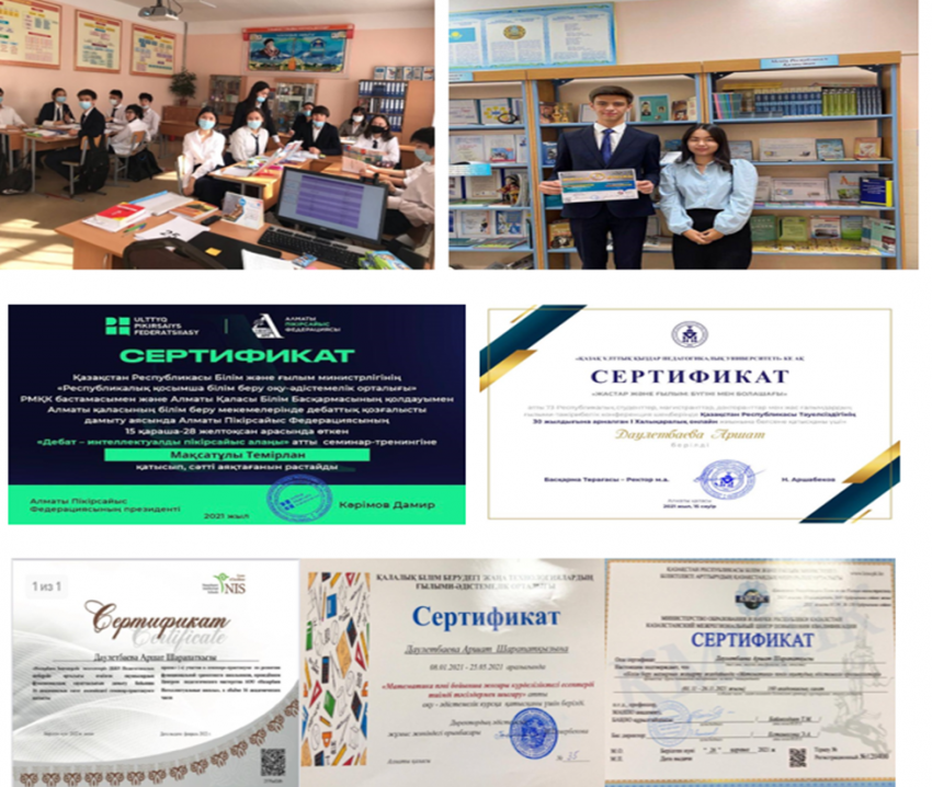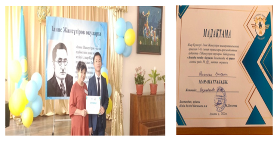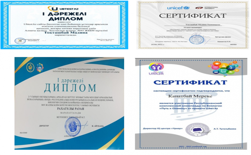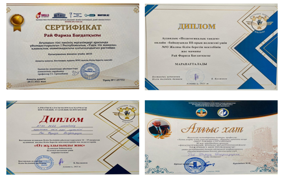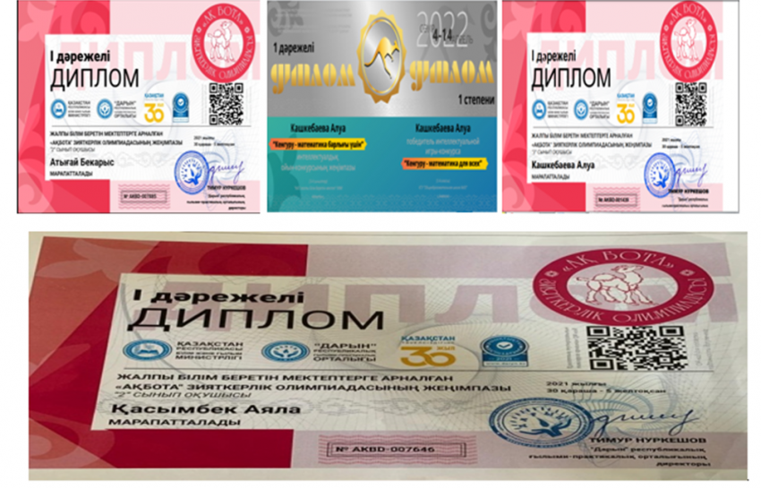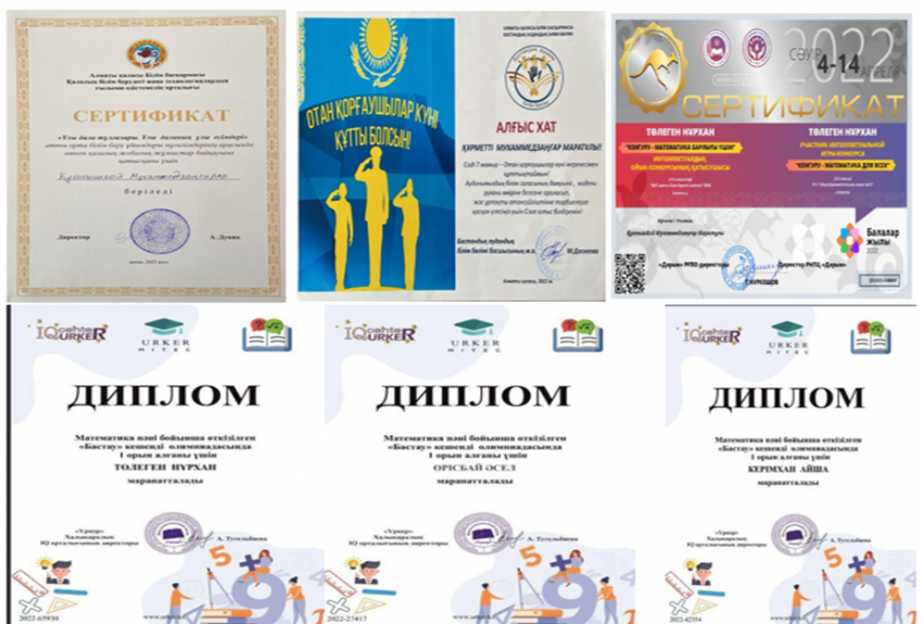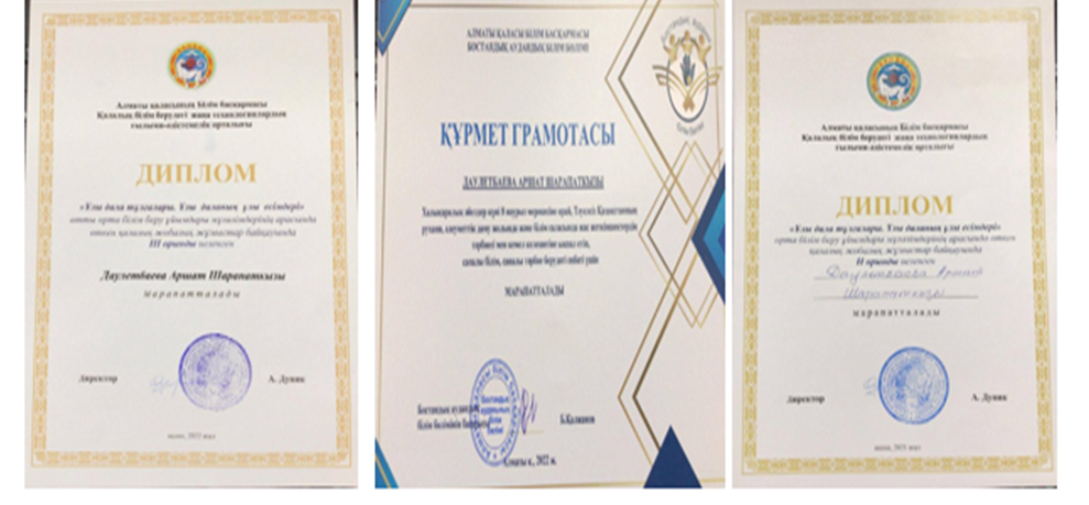 Республикалық интеллектуалды «Кемеңгер ұстаз» олимпиадасынан I (бірінші) дәрежелі диплом. Тіркеу №K-94250691.