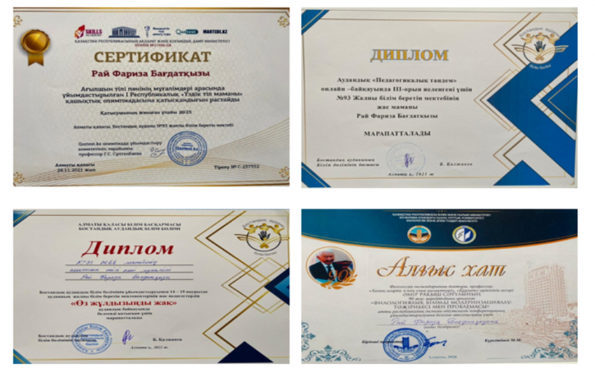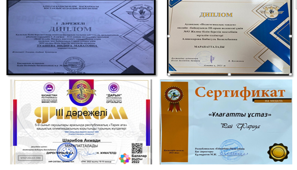 Колледж және мектеп мұғалімдерінің кәсіби біліктілігін арттыру мақсатында ұйымдастырылған IV Республикалық «Үздік педагог» олимпиадасының қорытынды кезеңінде үздік нәтиже көрсеткені үшін ҚҰРМЕТ ГРАМОТАСЫ. Тіркеу №Q-226952.