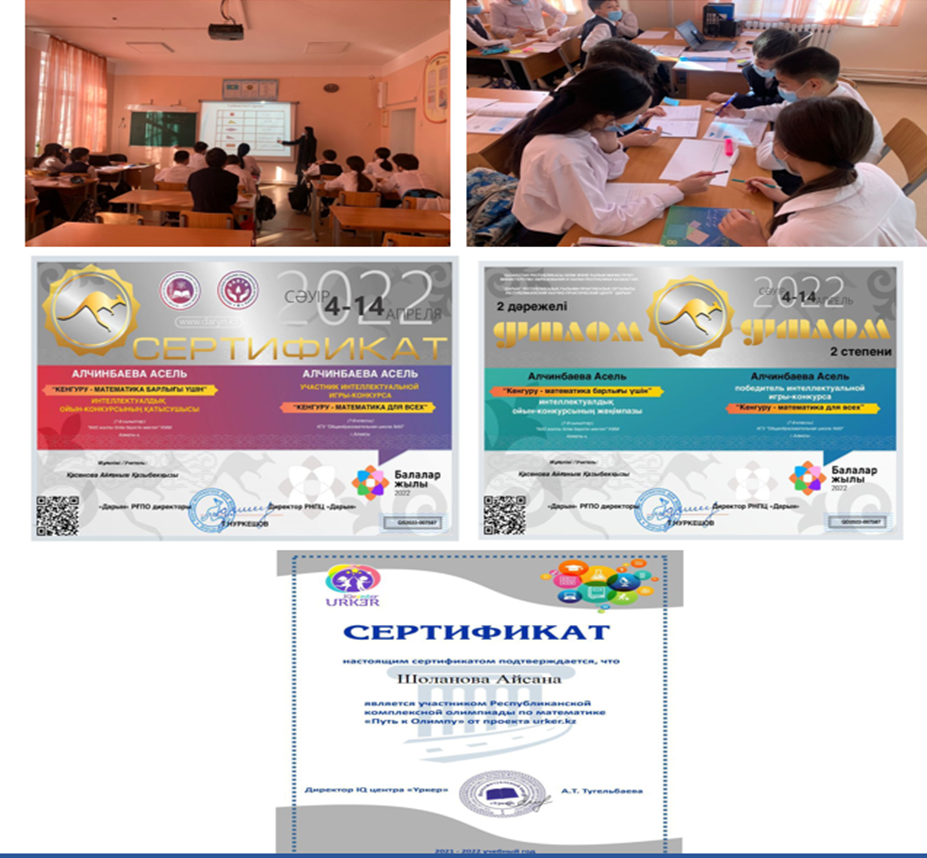 Мектеп оқушылары онлайн форматында өткен халықаралық, республикалық, қалалық, аудандық пәндік олимпиада, оқушылардың ғылыми жобалары, интеллектуалды сайыстар мен байқауларда жүлделі орындарға иеленді.