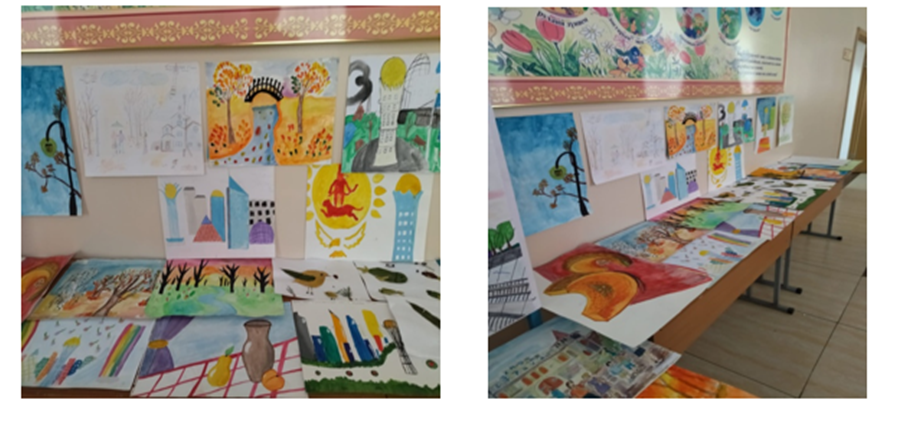 Көркем еңбек пәнінің мұғалімі Т.Н.Шернияз қазан айында «Алтын күз» мерекесіне байланысты, оқушылардың сурет, қол өнер бұйымдары бойынша мектепішілік көрме ұйымдастырды.