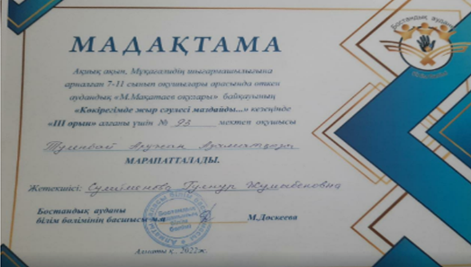 «Педагогикалық идеялар фестивалі» онлайн аудандық байқауына белсенді қатысқаны үшін ҚҰРМЕТ ГРАМОТАСЫ.