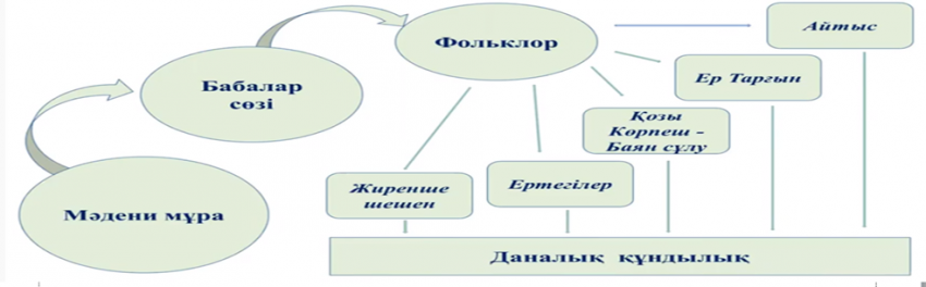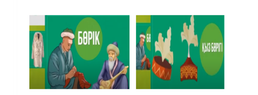Бейнебаяннан ұлттық киімдерді дана ата-бабамыз немен, қалай жасайтыны туралы мағлұмат алды. Сол арқылы сыни сұрақтар қойып, ұлттық киім туралы білімдерін жетілдірді. Тапсырмалар орындап, аңшы, батыр, серілердің киімдерімен салыстырды, балалардың өй-өрісін дамытатын жұмыстар жасап, оқушылардың білімін жетілдірді. «Білім сатысы» әдісі арқылы кері байланыс жасап, бағаланды.