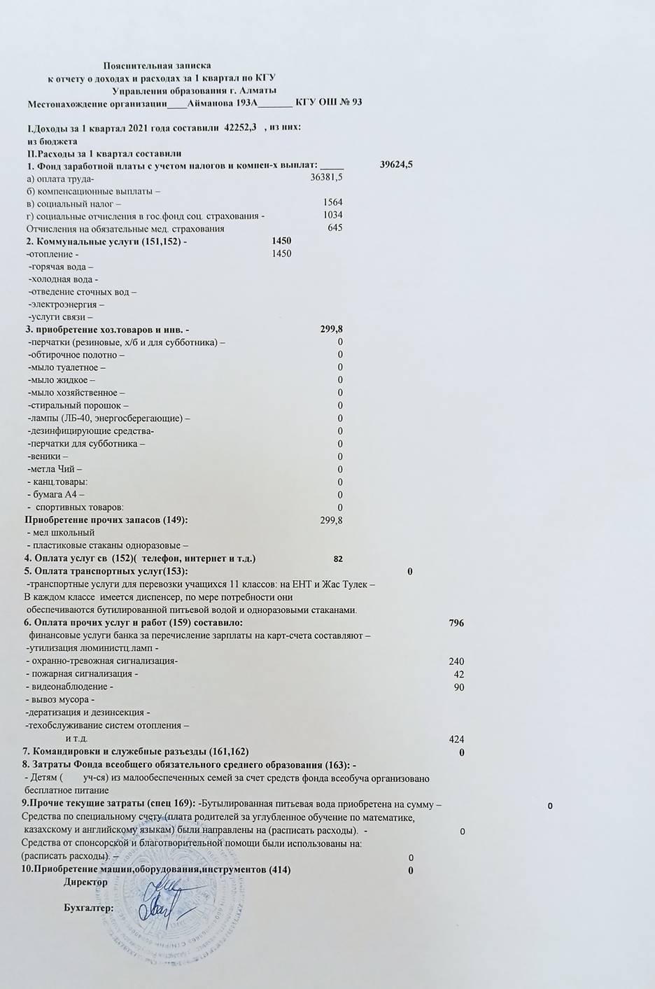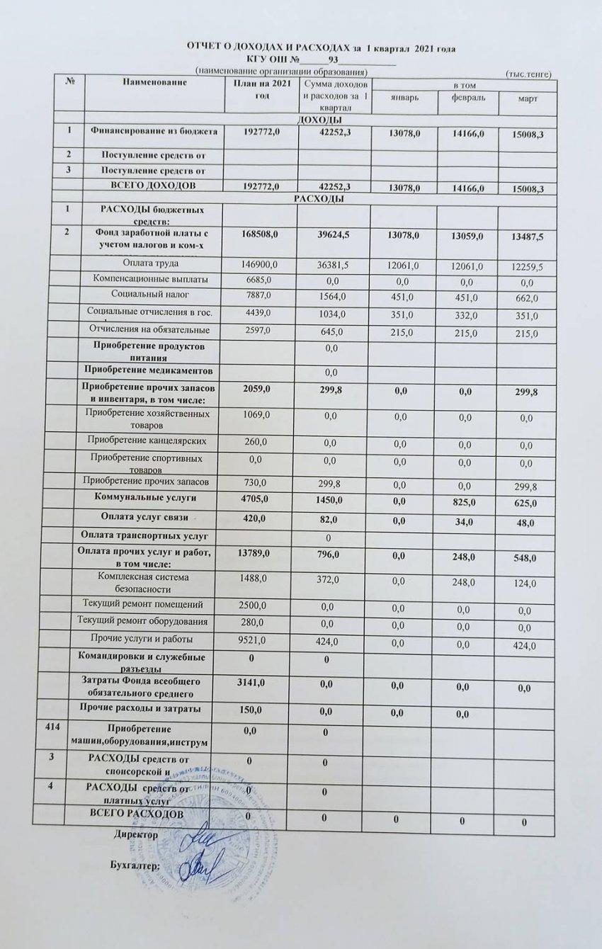 » 2021 жылдың I тоқсанындағы кірістер мен шығыстар туралы есеп