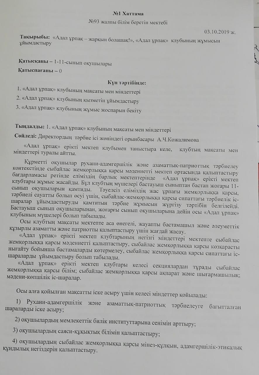 №93 ЖББМ -нің 2020-2021 оқу жылына арналған мектепшілік ерікті "Адал ұрпақ" клубының жоспары