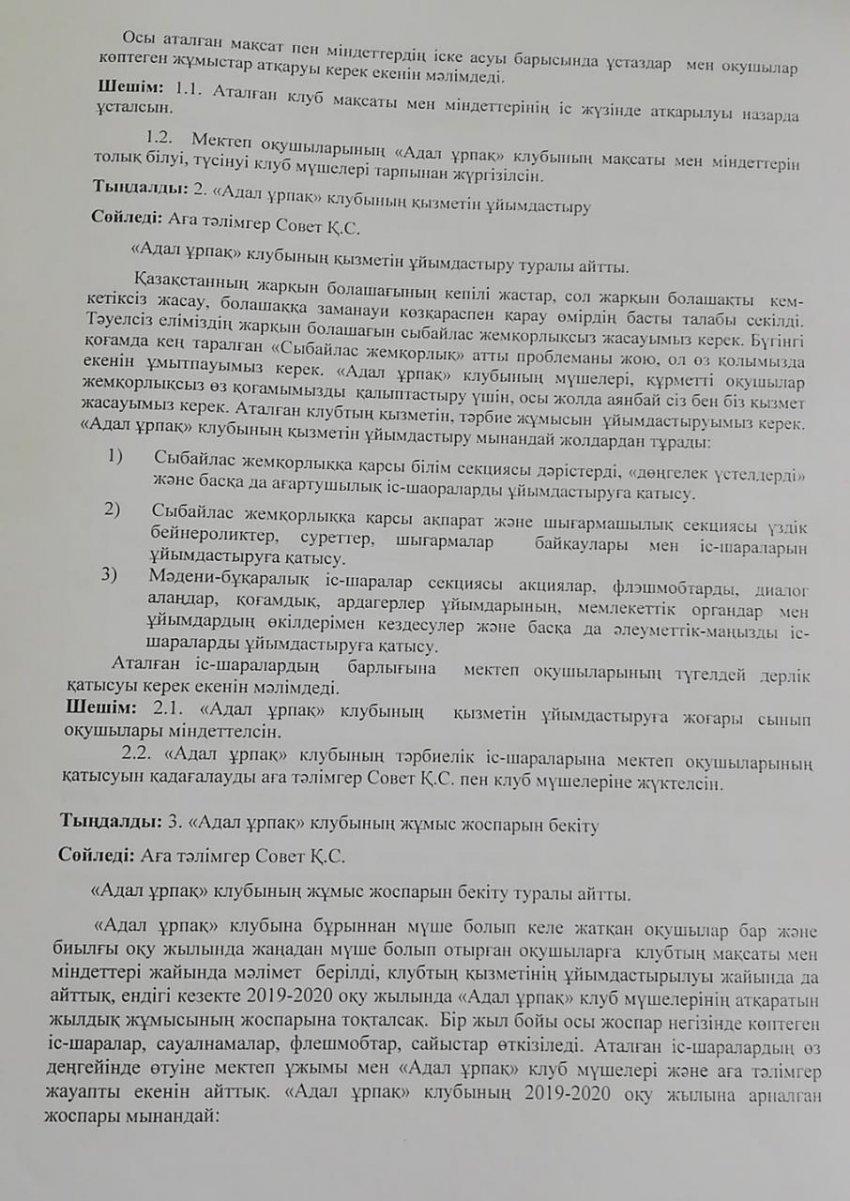 » "Адал ұрпақ - жарқын болашақ!" , "Адал ұрпақ" клубының жұмысын ұйымдастыру