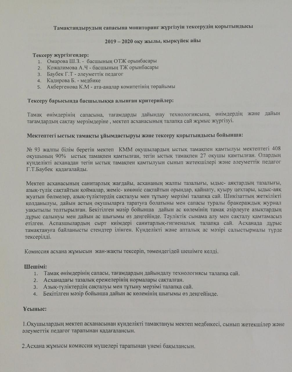 » Тамақтандырудың сапасына мониторинг жүргізуін тексерудің қорытындысы