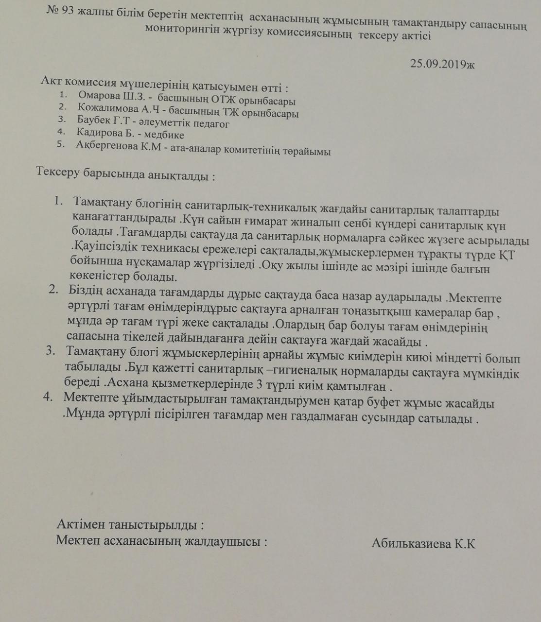 25 қыркүйек 2019 №93 жалпы білім беретін мектептің асханасының жұмысының тамақтандыру сапасының мониторингін жүргізу комиссиясының тексеру актісі
