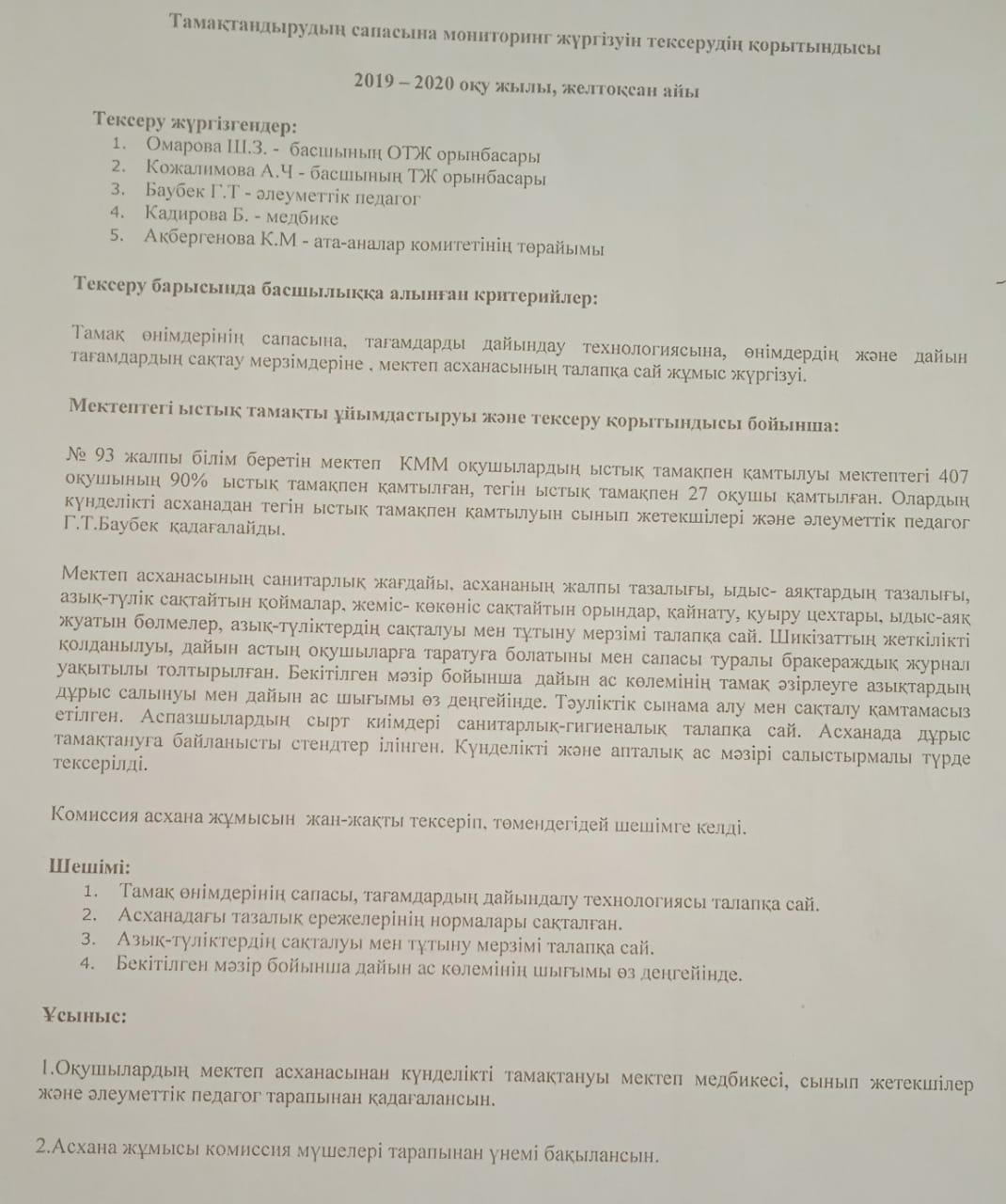 » Тамақтандырудың сапасына мониторинг жүргізуін тексерудің қорытындысы