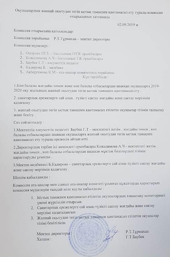 » » » Оқушылардың жаппай оқытудан тегін ыстық тамақпен қамтамасыз ету туралы комиссиясы отырысының хаттамасы
