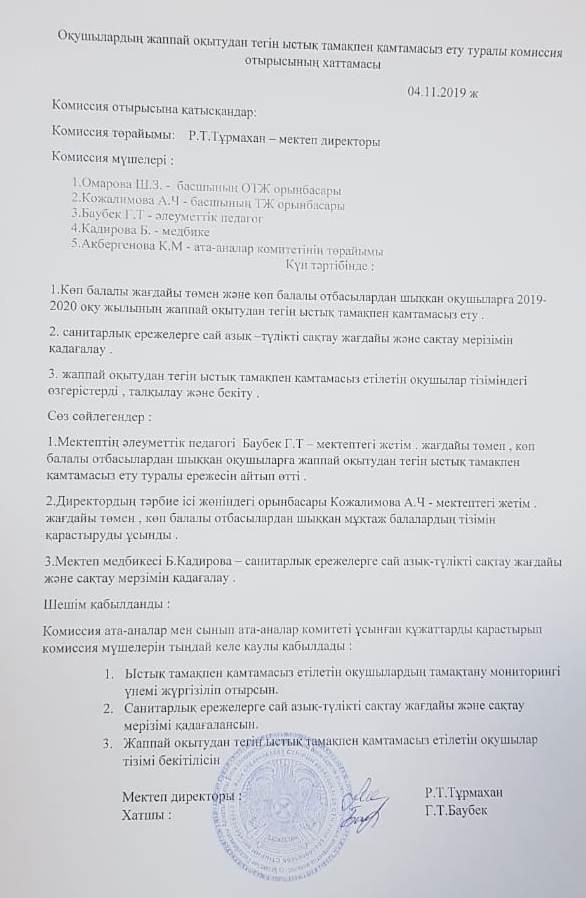 04 қараша 2019 Оқушылардың жаппай оқытудан тегін ыстық тамақпен қамтамасыз ету туралы комиссия отырысының хаттамасы