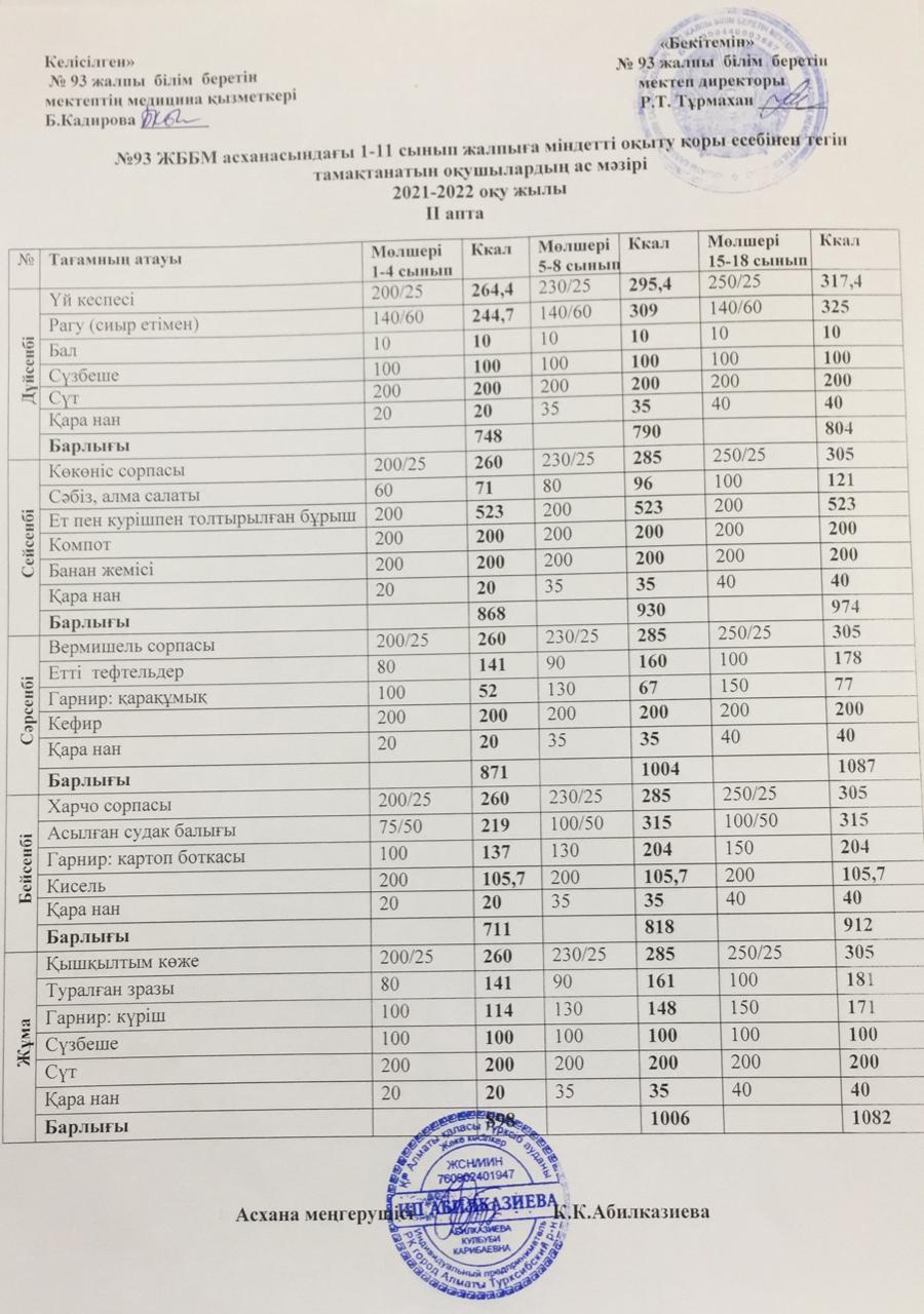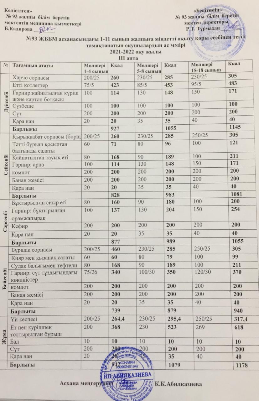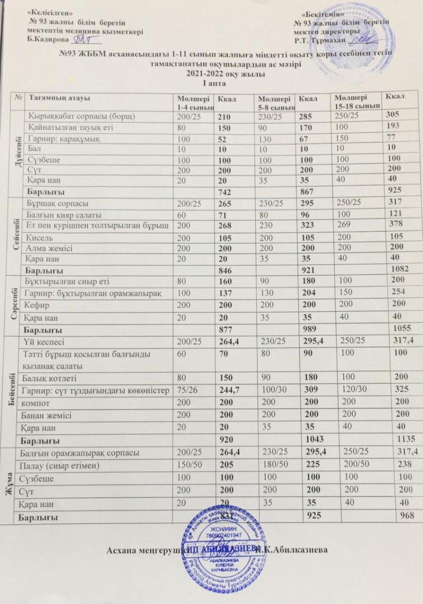 25 тамыз 2021 Жалпыға бірдей міндетті оқу қоры есебінен тегін тамақтанатын оқушылардың ас-мәзірі І, ІІ, ІІІ, ІV апта