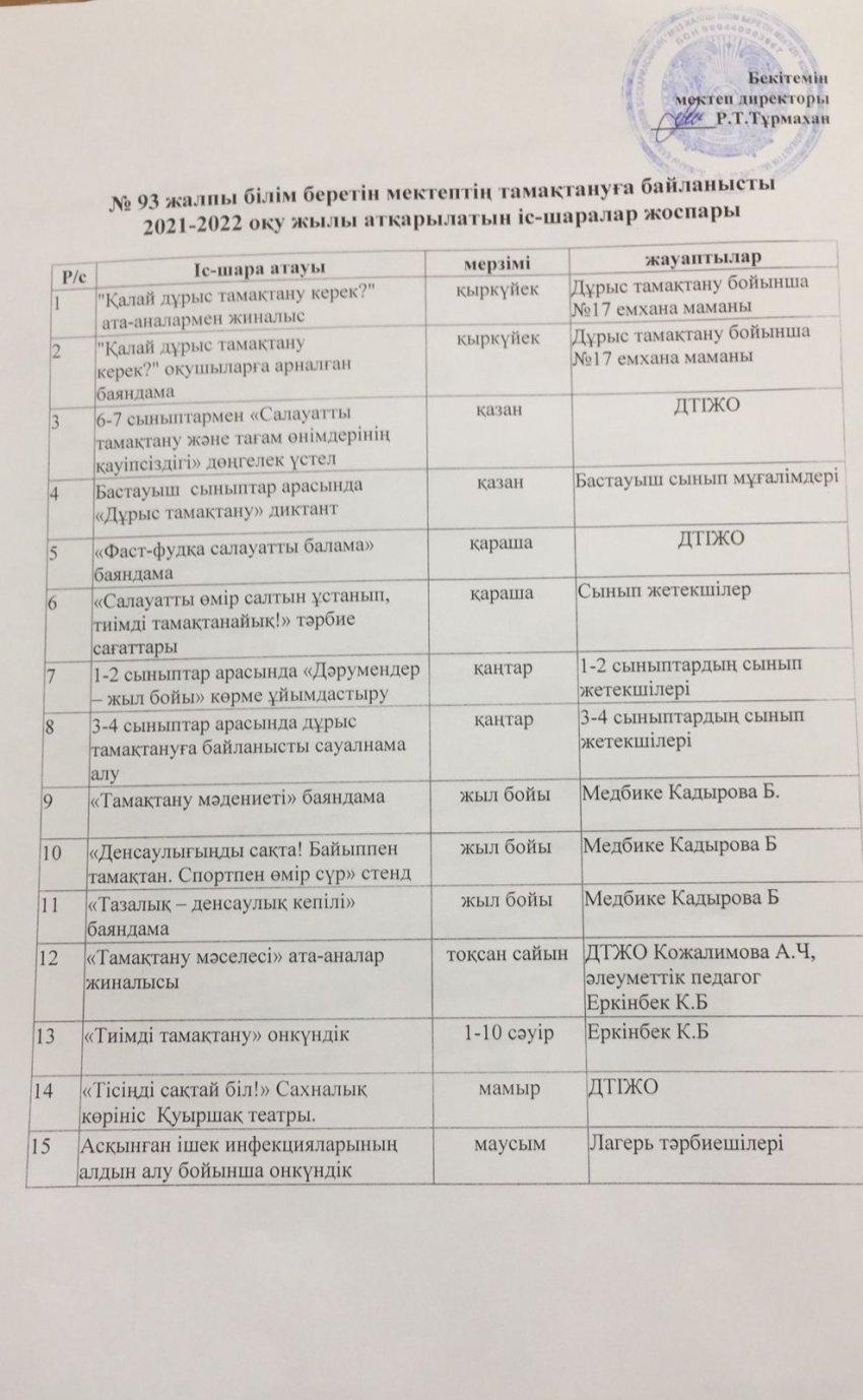 » Тамақтануға байланысты 2021-2022 оқу жылы атқарылатын іс-шаралар жоспары