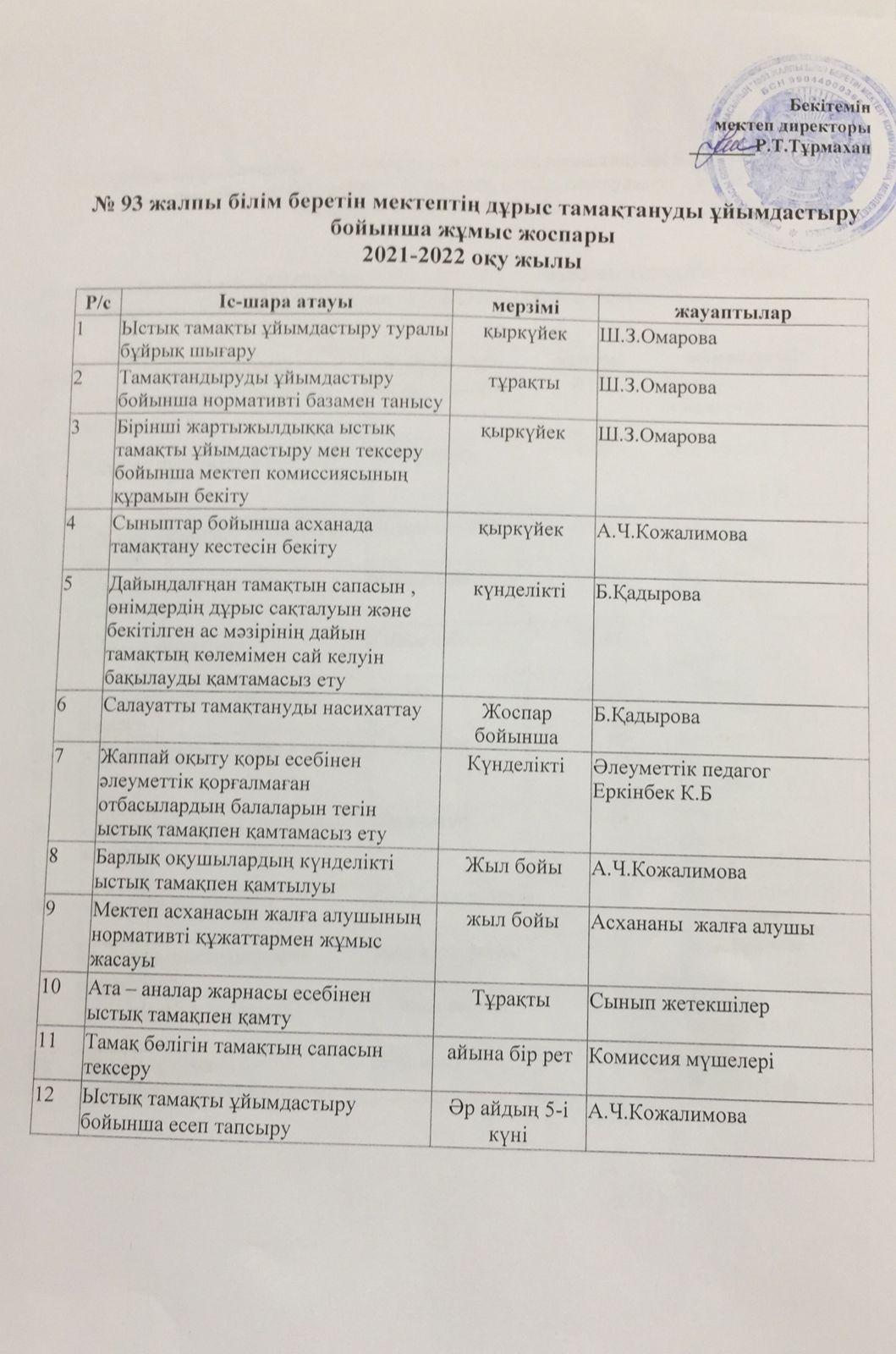 » Дұрыс тамақтандыруды ұйымдастыру бойынша жұмыс жоспары 2021-2022 оқу жылы