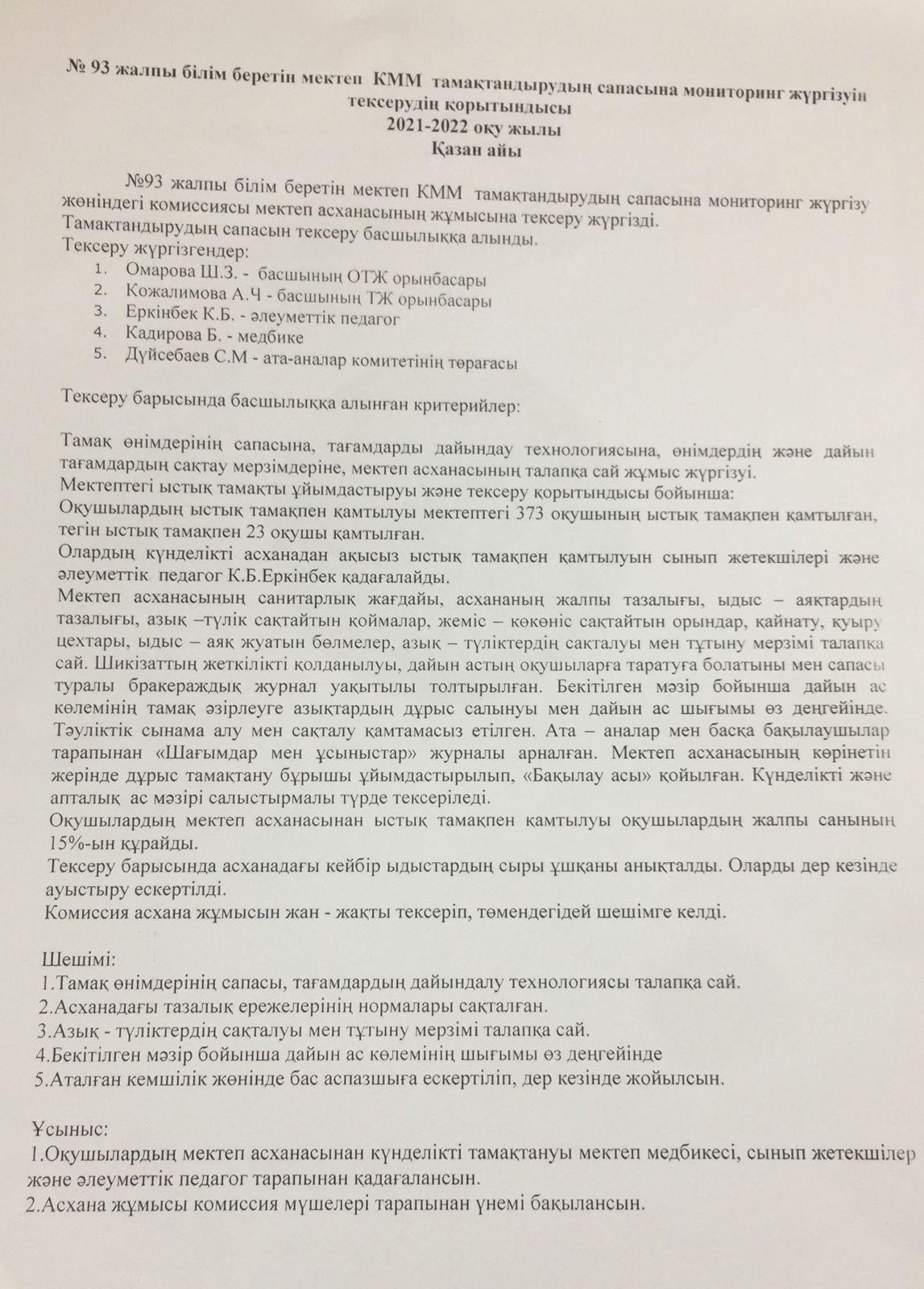 Тамақтану сапасына мониторинг жүргізу қорытындысы 2021-2022 оқу жылы