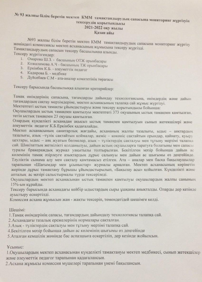 » Тамақтану сапасына мониторинг жүргізу қорытындысы