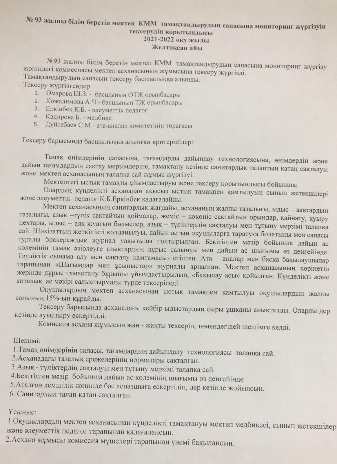 Тамақтану сапасына мониторинг жүргізу қорытындысы 2021-2022 оқу жылы