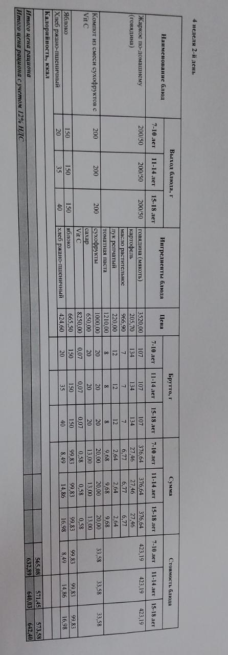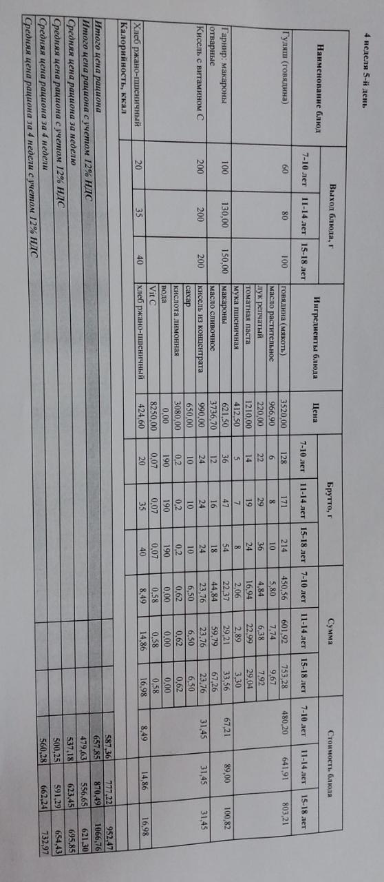 №93 жалпы білім беретін мектеп асханасындағы Жалпыға міндетті оқыту қоры есебінен тегін тамақтанатын оқушылардың 2020 жылға арнналған (қыс- көктем) ас мәзірі І ІІ ІІІ ІV апталары