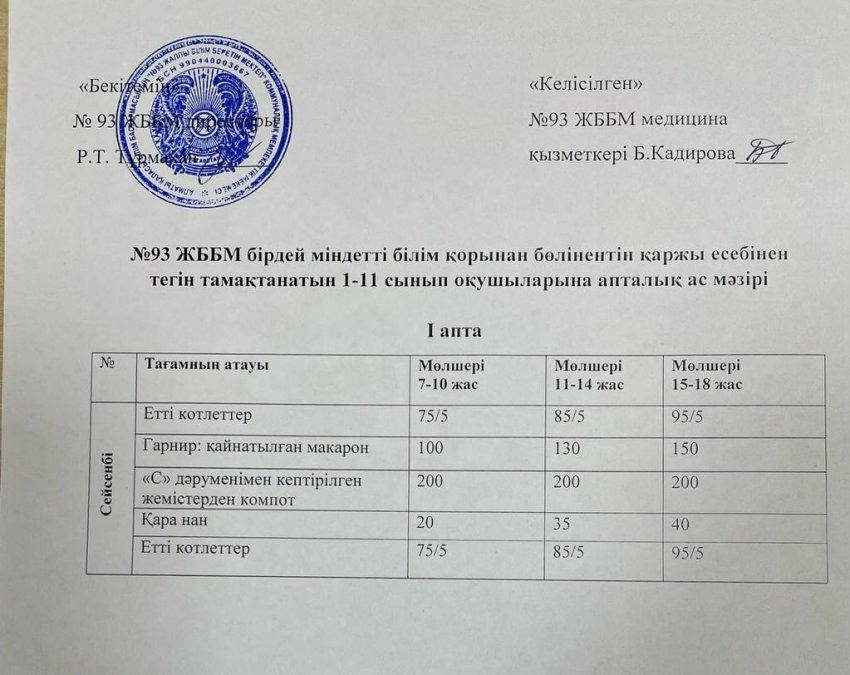 Жалпыға бірдей міндетті оқу қоры есебінен тегін тамақтанатын оқушылардың ас-мәзірі І, ІІ, ІІІ, ІV апта
