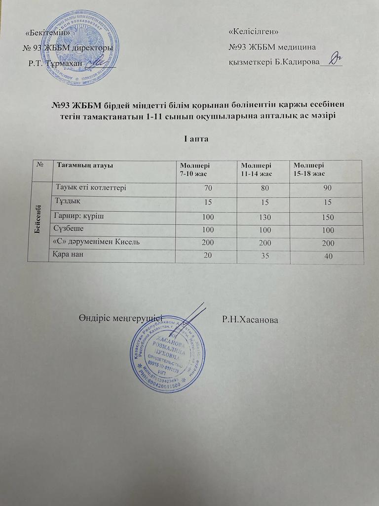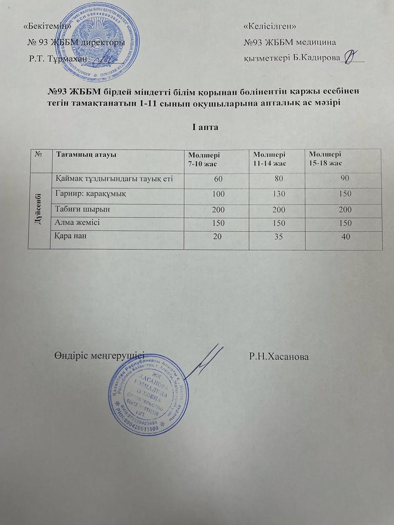 Жалпыға бірдей міндетті оқу қоры есебінен тегін тамақтанатын оқушылардың ас-мәзірі І, ІІ, ІІІ, ІV апта